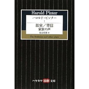ハロルド・ピンターHarold Pinter ~ 『ハロルド・ピンター1 温室・背信・家族の声』 Harold Pinter translator 喜志哲雄Kishi Tetsuo Publisherハヤカワ演劇文庫Hayakawa Engeki bunko23 2009 7 ISBN9784151400230 「温室」 「背信」 「家族の声」 『ハロルド